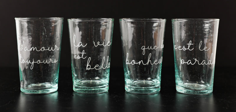 Ces verres transparents aux reflets aquatiques sont fabriqués à partir de verres recyclés et soufflés bouche au Maroc.