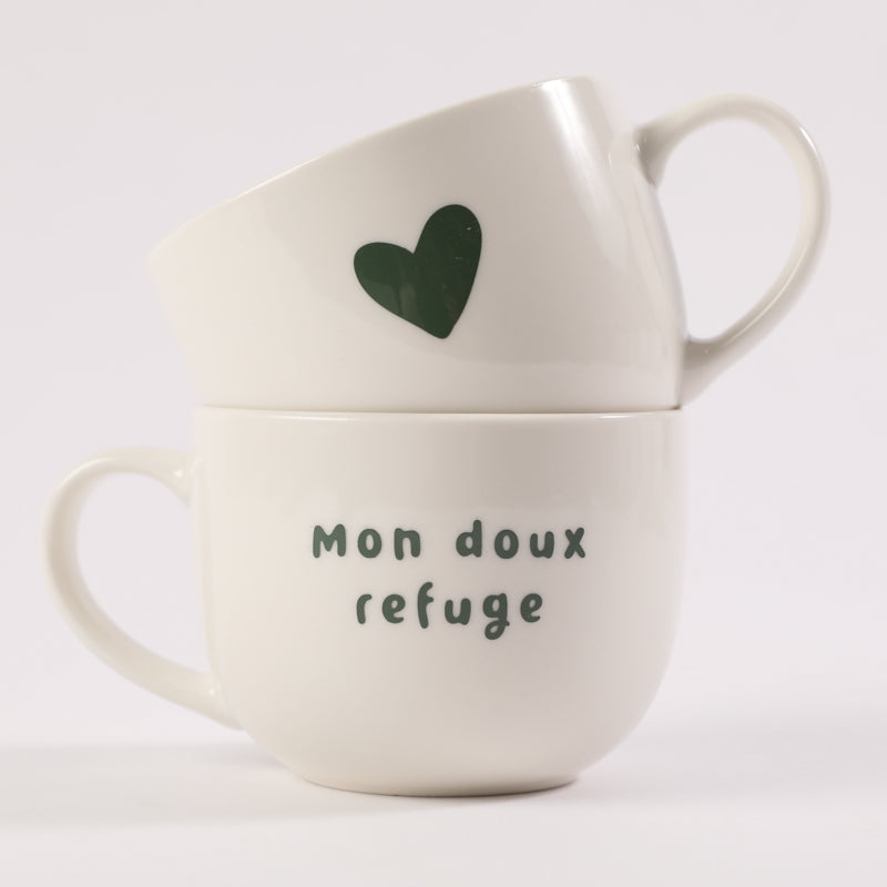 texte sur la tasse: MON DOUX REFUGE d'un coté, et COEUR de l'autre.