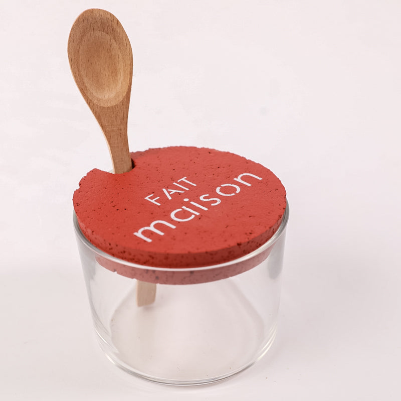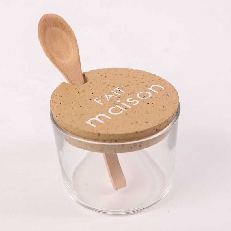 Matière: Pot en verre, bouchon en liège et cuillère en hêtre